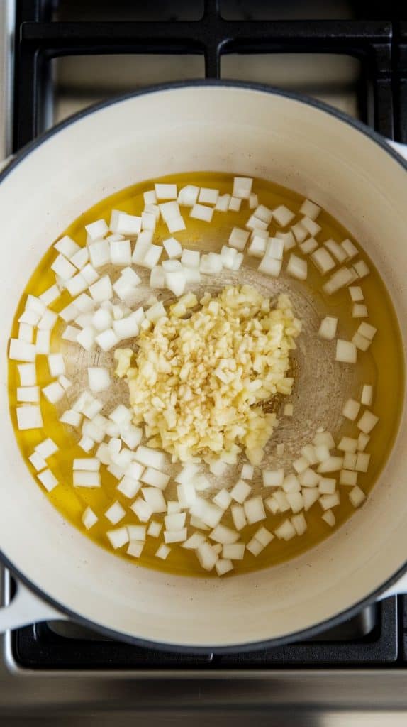 In a medium pot, heat 1 tablespoon olive oil over medium heat. Add ½ finely diced white onion and 2 cloves minced garlic. Cook for 2–3 minutes until soft and fragrant.