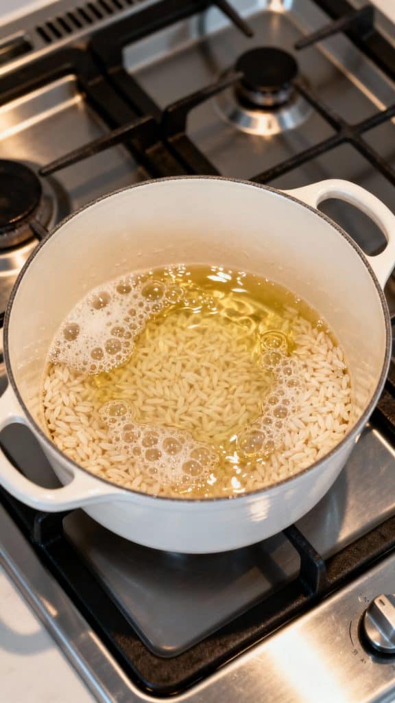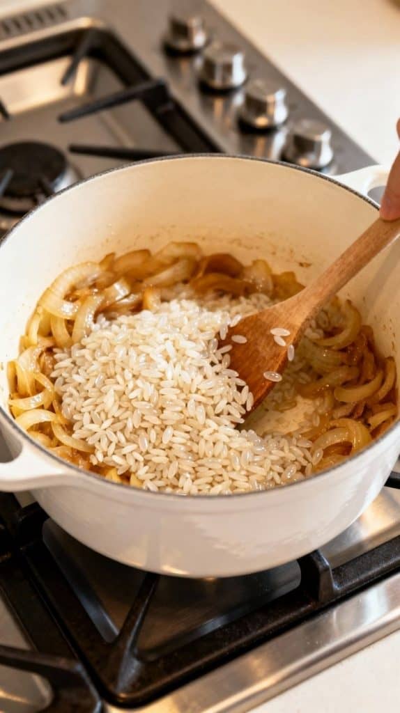 - Using cold broth – Warm broth helps the rice cook evenly without cooling down the pan.