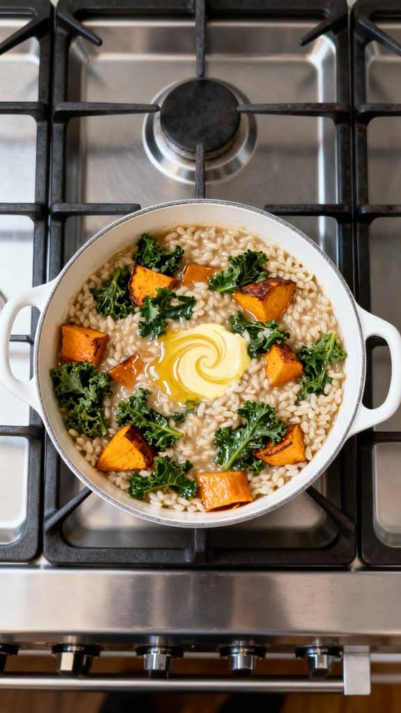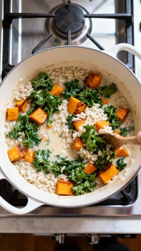 Once the rice is tender and creamy, stir in 2 cups chopped kale and the roasted squash. Cook for 2–3 more minutes until kale is wilted.