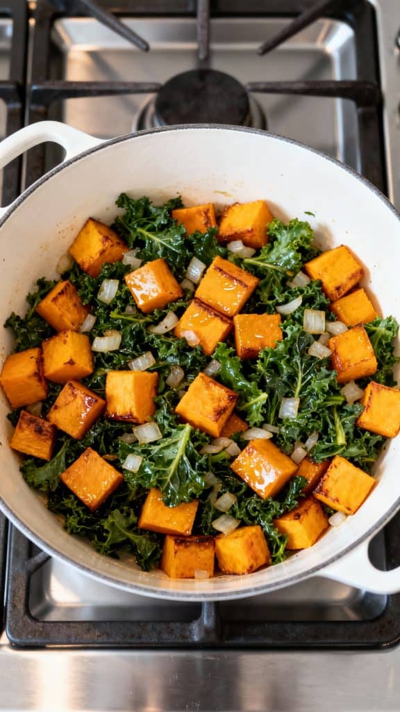 Roasting the squash caramelizes its natural sugars, making it sweeter and more flavorful. Sautéing garlic and onion releases their oils and aromas, building a deep flavor base. The kale softens from the steam, making it easier to chew and digest while holding onto its nutrients.