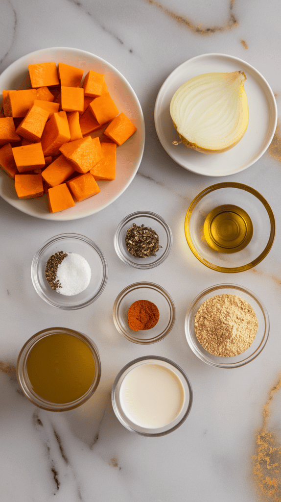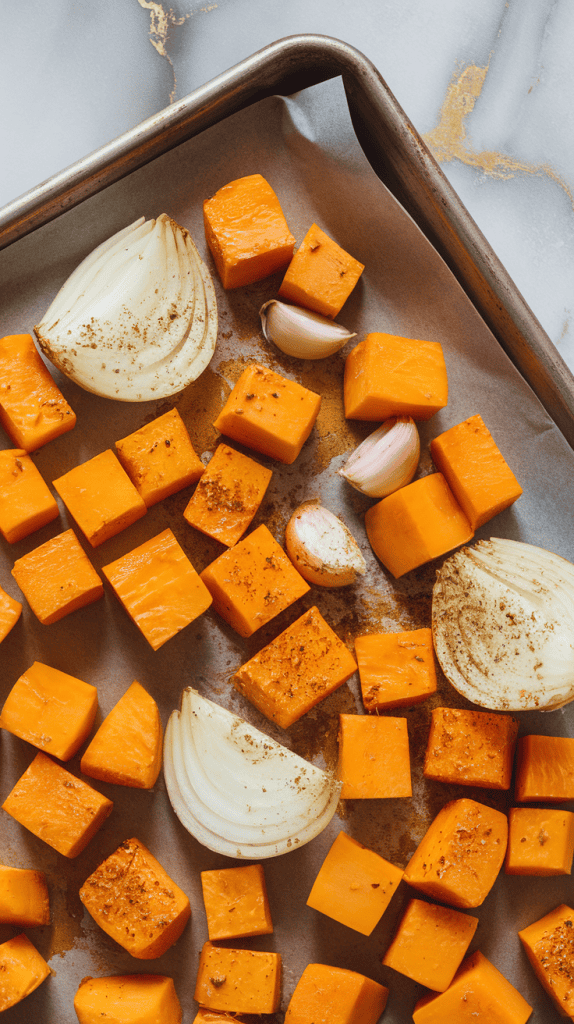Preheat your oven to 400°F. On a parchment-lined baking sheet, spread out 3 cups of butternut squash cubes, 1 small yellow onion (quartered), and 3 peeled garlic cloves. Drizzle with 1 tablespoon olive oil and sprinkle with 1 teaspoon salt, ½ teaspoon black pepper, ½ teaspoon dried thyme, and ¼ teaspoon smoked paprika (optional). Toss gently, then roast for 25–30 minutes until soft and golden.