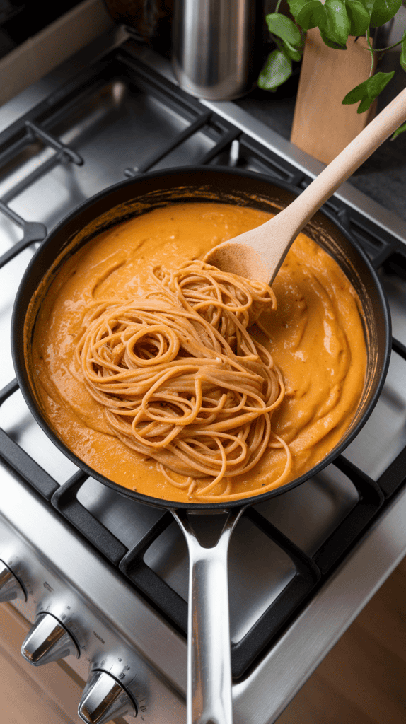 Pour the blended sauce into a skillet over medium heat. Stir until warm and gently bubbling, about 3–5 minutes. Add the cooked pasta and toss to coat.