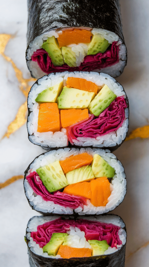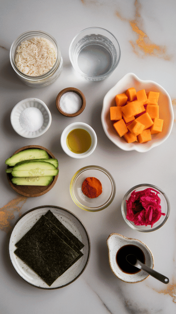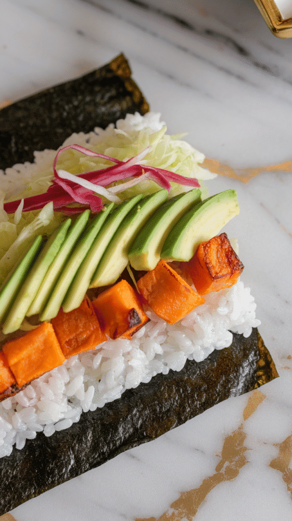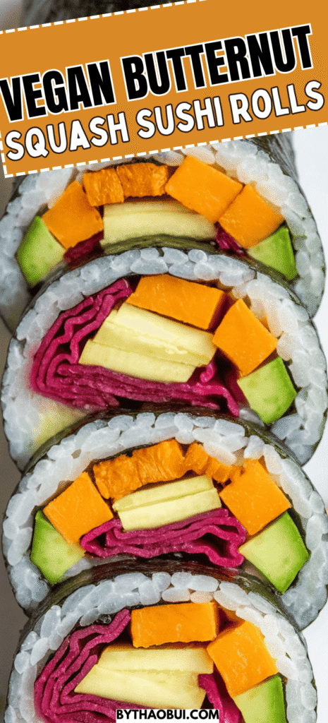 You don’t need any raw fish or special equipment—just some roasted squash, rice, fresh veggies, and a little patience with the rolling part (you’ll get the hang of it!).