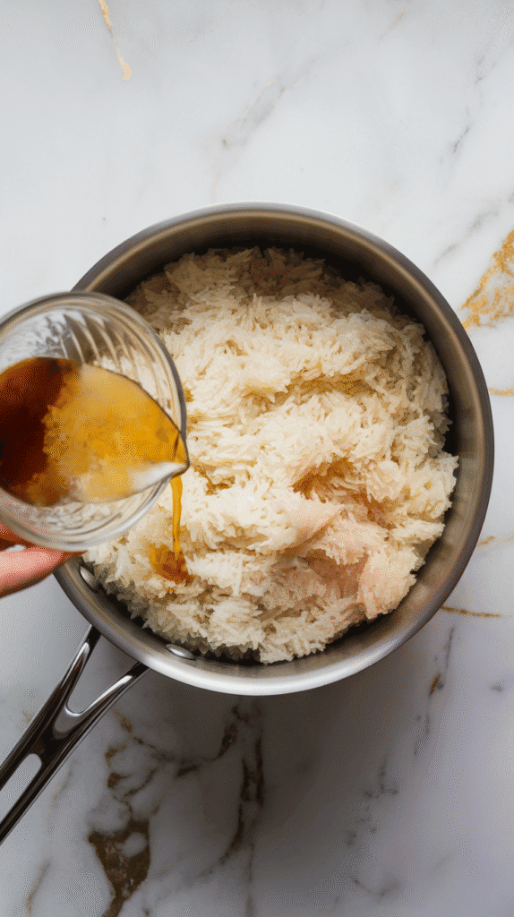 In a small bowl, mix 2 tbsp rice vinegar, 1 tbsp sugar, and 1/2 tsp salt. Gently fold into the cooked rice with a spoon or rice paddle. Let cool.