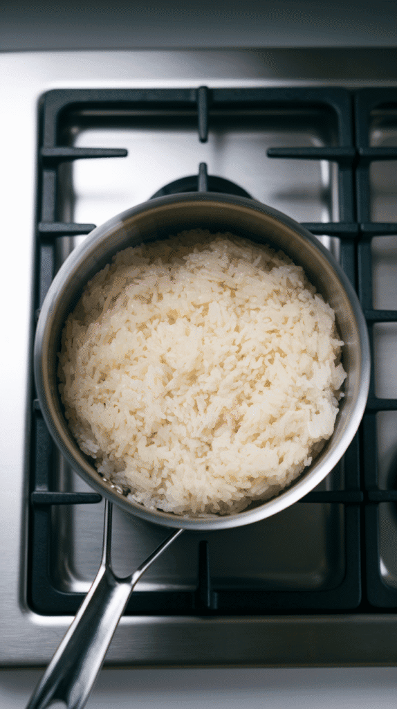 Rinse 1 cup sushi rice under cold water until the water runs clear. Add it to a pot with 1 1/4 cups water, bring to a boil, then reduce heat to low and cover. Cook for 18 minutes, then remove from heat and let sit for 10 minutes.