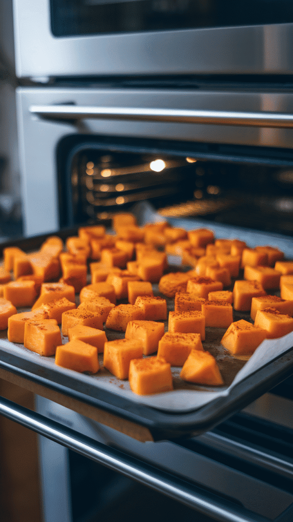 Toss 1 1/2 cups cubed butternut squash with 1 tbsp olive oil, 1/2 tsp garlic powder, and 1/2 tsp smoked paprika. Spread on a parchment-lined baking sheet and roast at 400°F (200°C) for 25 minutes, flipping halfway through.