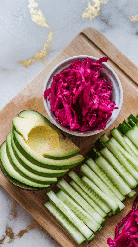 Slice 1 ripe avocado, cut 1/2 cucumber into matchsticks, and get 1/2 cup pickled red cabbage ready.