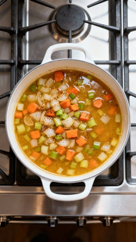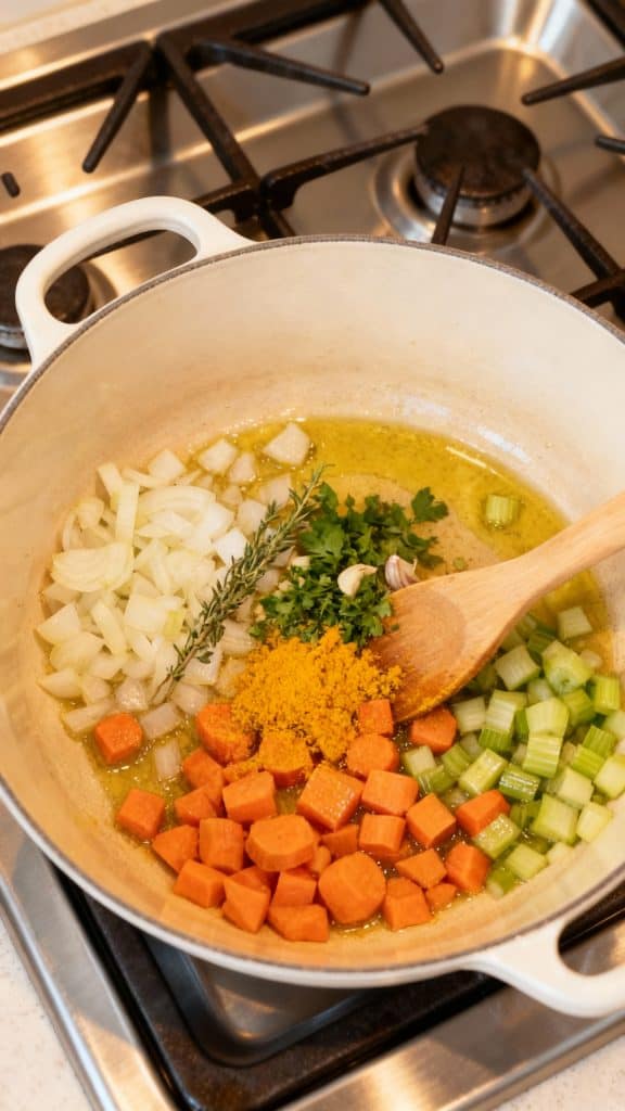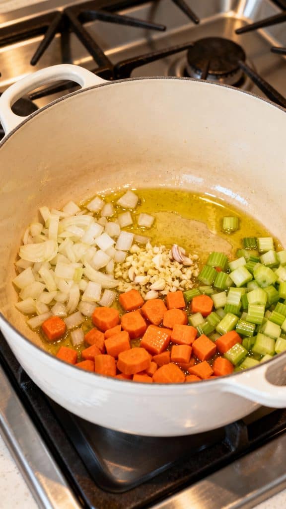 Heat 1 tablespoon olive oil in a large pot over medium heat. Add 1 diced onion, 3 minced garlic cloves, 3 diced carrots, and 2 diced celery stalks. Cook for 5–6 minutes until veggies start to soften and the onion is translucent.