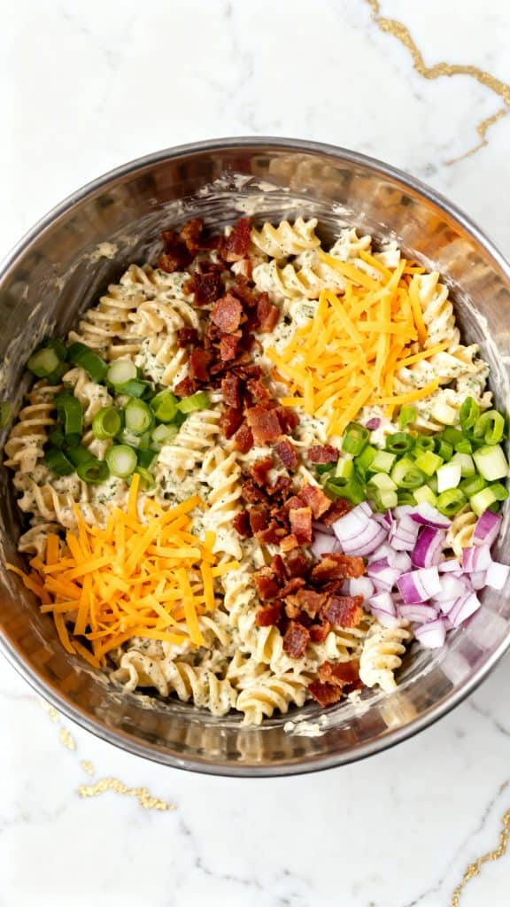 Add ¾ cup shredded vegan cheddar cheese, ½ cup vegan bacon bits, 3 sliced green onions, and ¼ cup diced red onion. Gently stir until everything is evenly mixed.