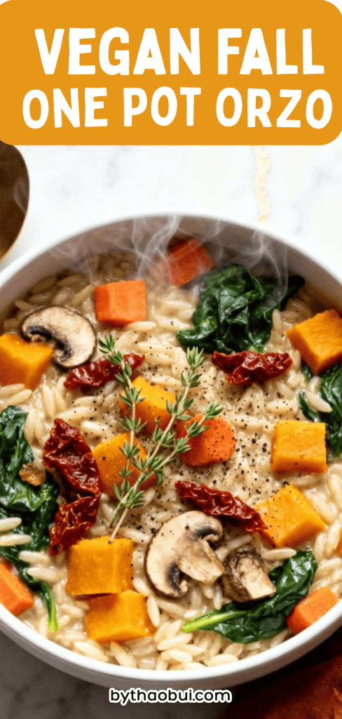 This vegan fall one-pot orzo is exactly the kind of meal that makes you feel like you’ve got it all together—even when it’s a chilly, messy Tuesday night. It’s fast, filling, and flavorful. Give it a try and let me know how it turns out! Drop a comment if you have questions or want to share your twist on it!