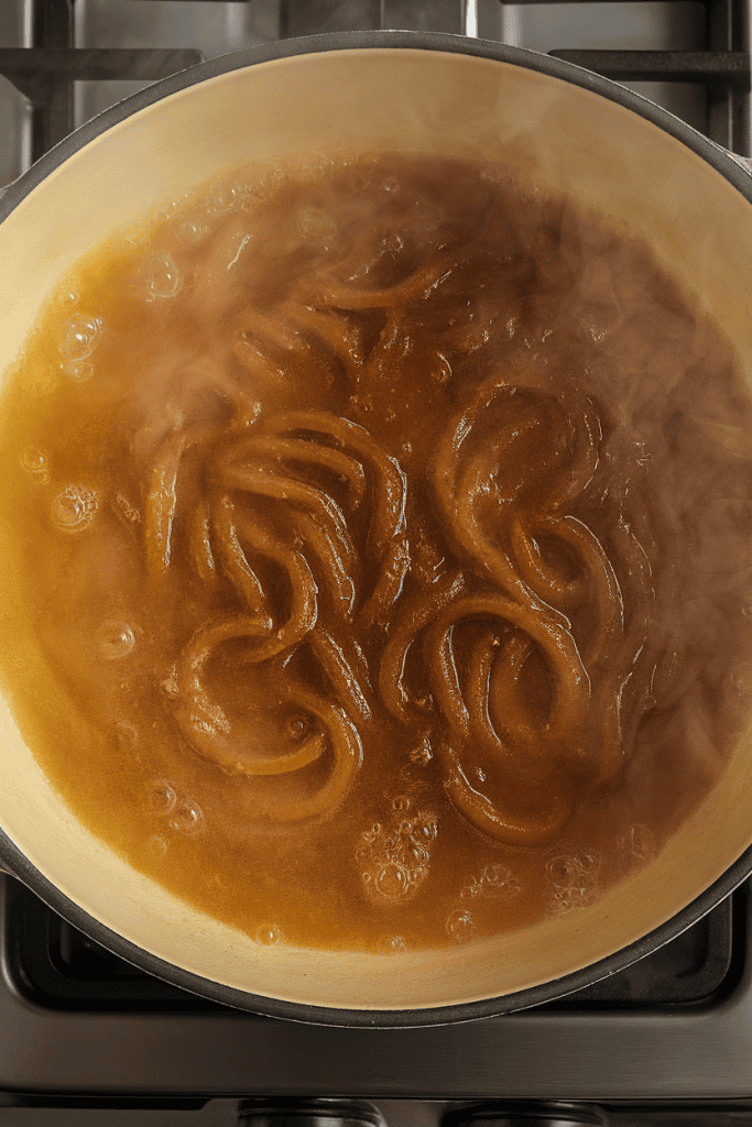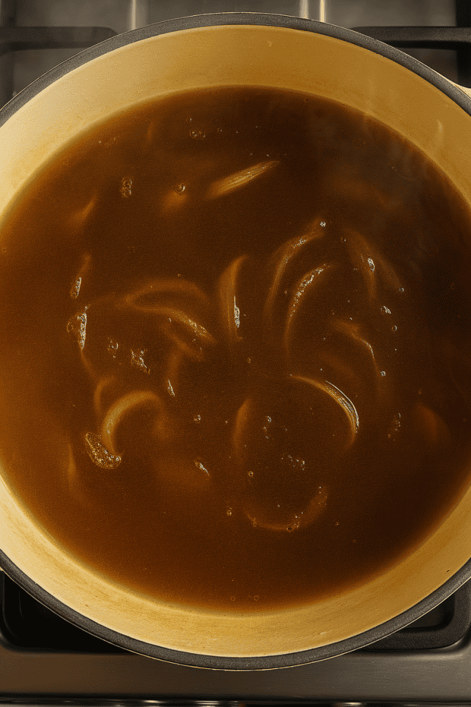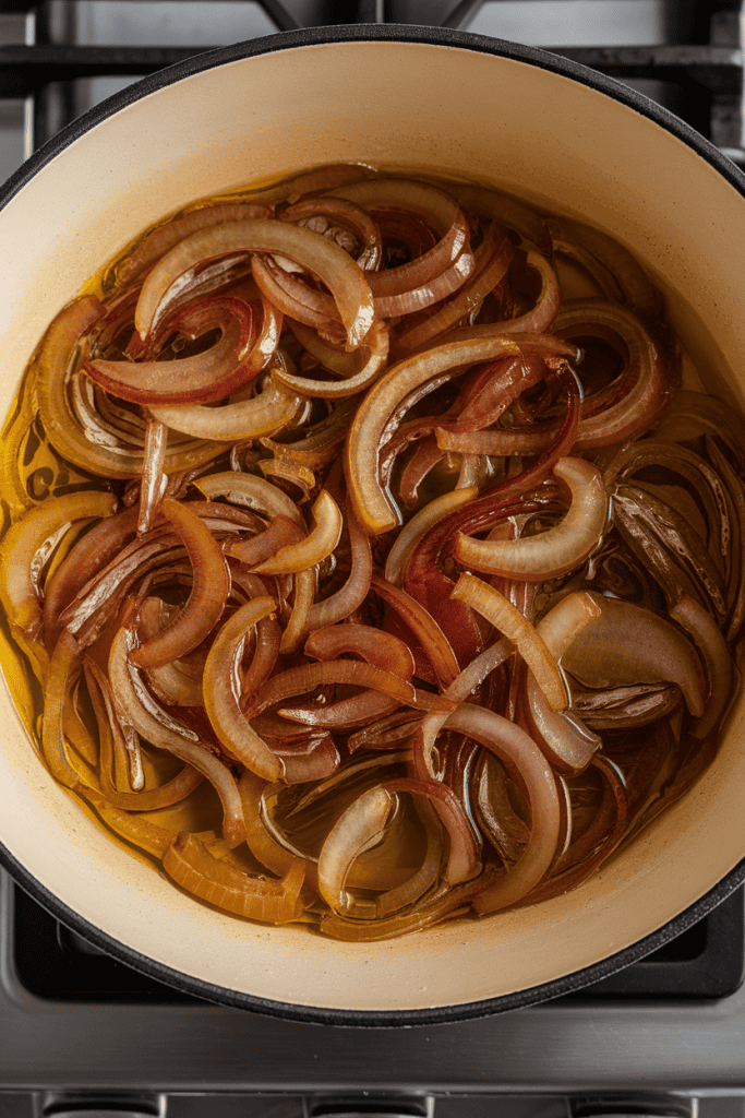 Heat 3 tbsp olive oil in a large Dutch oven over medium heat. Add 4 large yellow onions (thinly sliced). Cook for 25–30 minutes, stirring every few minutes, until deep golden brown.