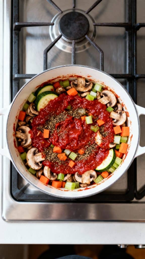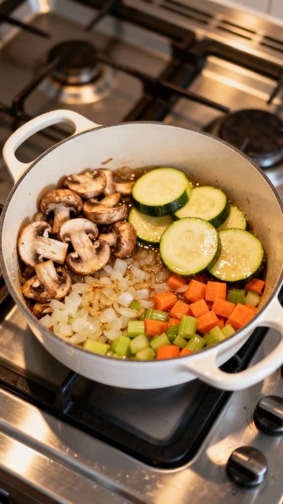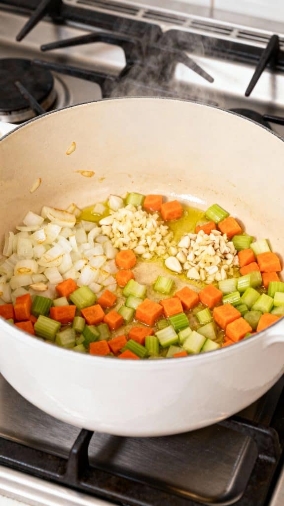 Heat 2 tbsp olive oil in a large pot over medium heat. Add 1 diced onion, 4 minced garlic cloves, 2 diced carrots, and 2 diced celery stalks. Sauté for 5–7 minutes, stirring often, until the veggies are softened and starting to brown.