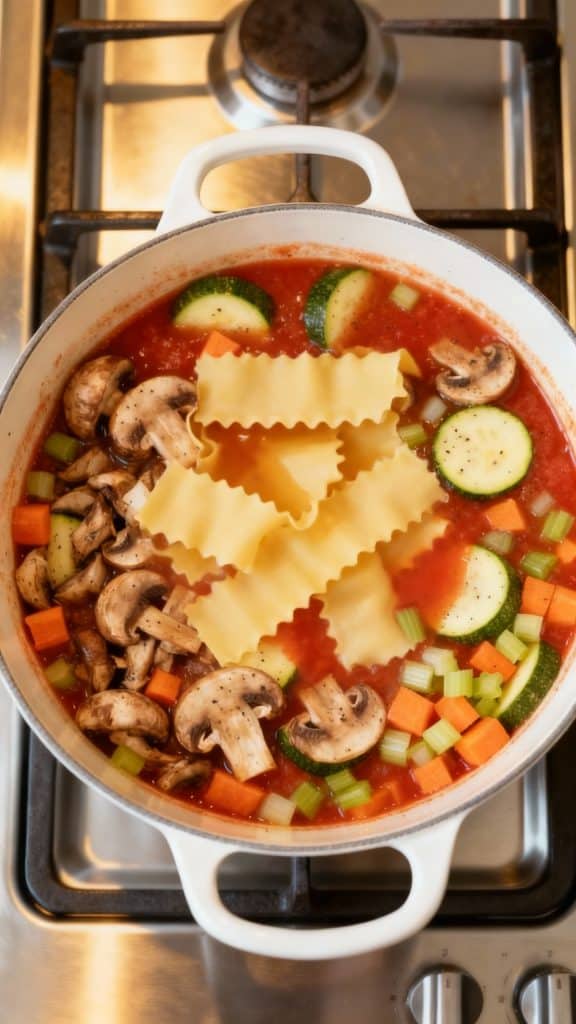 Add 8 oz broken lasagna noodles to the pot. Simmer for 10–12 minutes, stirring occasionally, until the noodles are just tender.