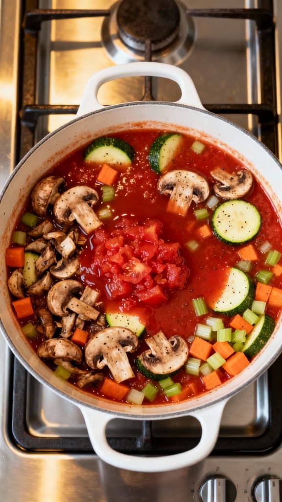 Pour in 1 can (28 oz) crushed tomatoes and 6 cups vegetable broth. Stir to combine, bring to a boil, then lower heat and let simmer for 10 minutes.