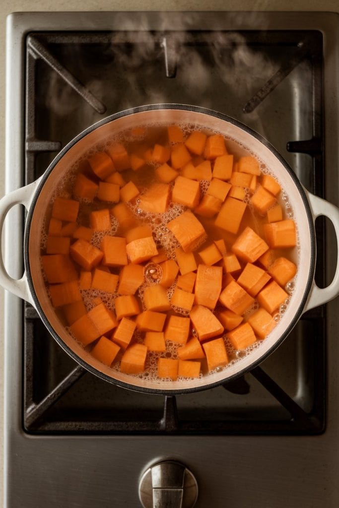 Add 2 large peeled and cubed sweet potatoes to a pot of salted water. Bring to a boil and cook for about 12-15 minutes, until fork tender.