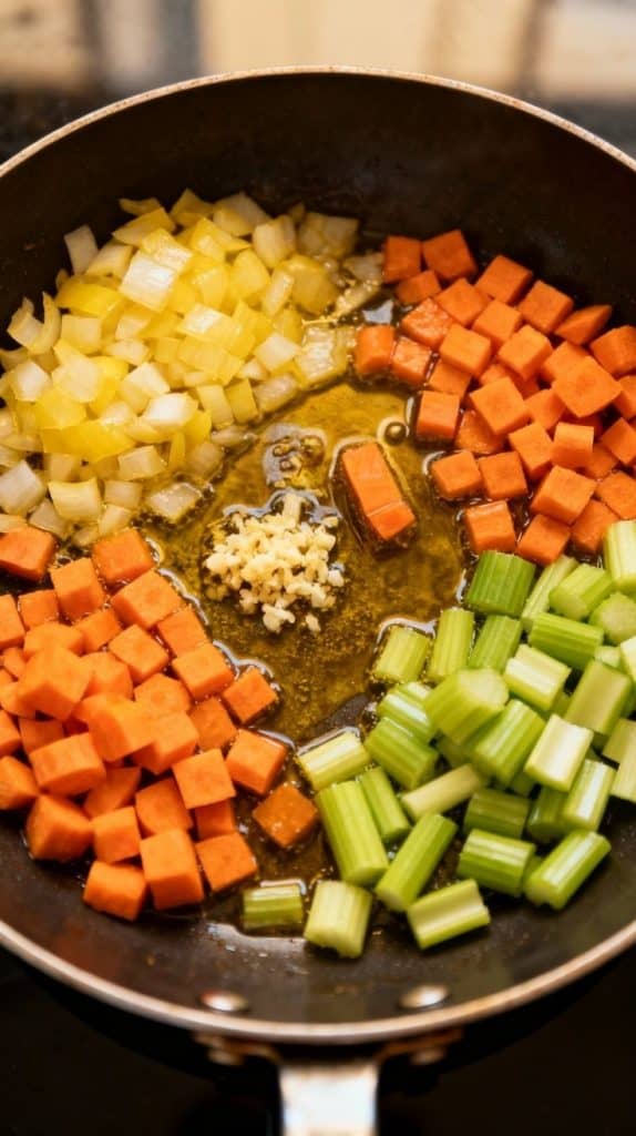 Heat 1 tbsp olive oil in a skillet. Add 1 diced yellow onion, 2 minced garlic cloves, 2 diced carrots, and 2 diced celery stalks. Cook for 5-7 minutes until soft.