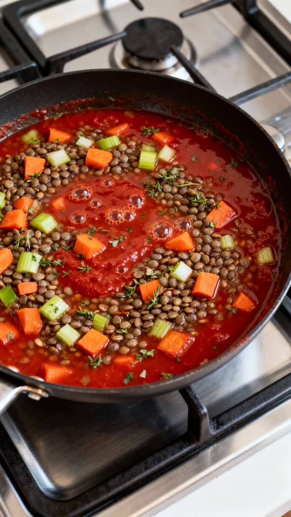 Pour in 3 cups vegetable broth. Bring to a boil, then reduce heat and simmer for 25-30 minutes, stirring occasionally, until lentils are tender and liquid is mostly absorbed.