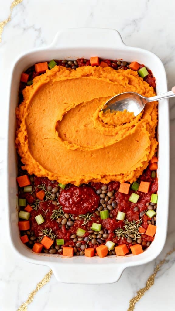 Pour the lentil mixture into a baking dish. Spoon the mashed sweet potatoes on top and smooth them out evenly.