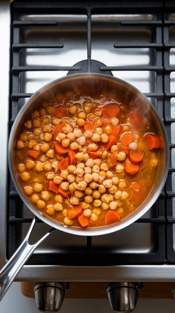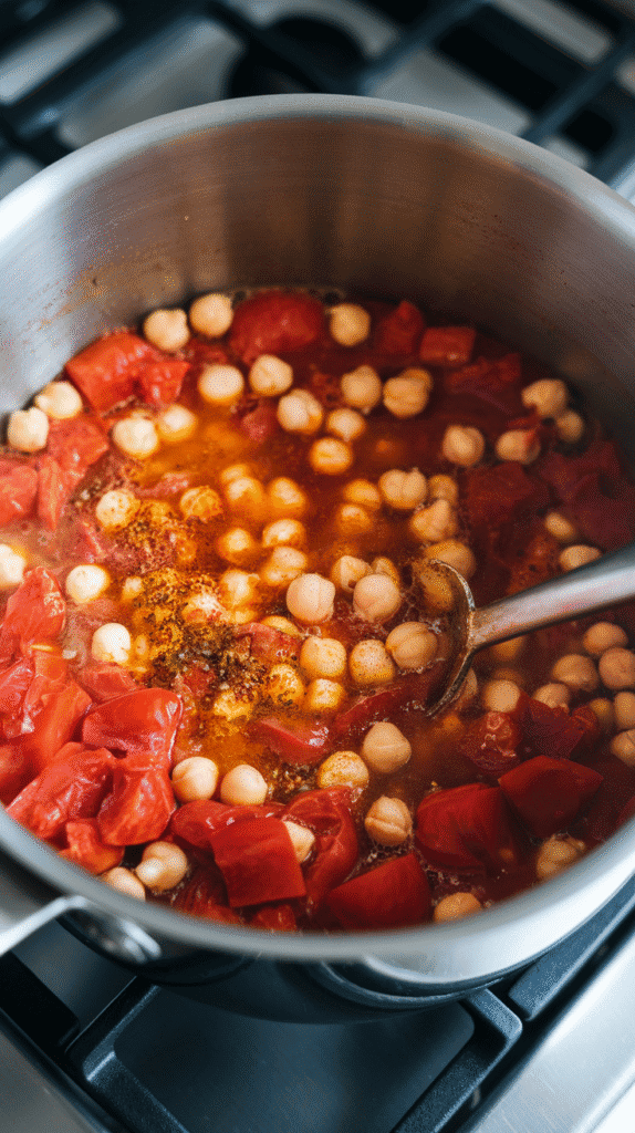 Pour in 1 (15 oz) can diced tomatoes, 1 (15 oz) can chickpeas (drained and rinsed), and 2 cups of vegetable broth. Stir everything together and bring to a boil.