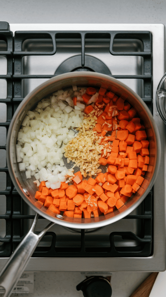 Stir in 3 minced garlic cloves and 2 chopped carrots. Cook for another 3 minutes, stirring occasionally, until the garlic smells fragrant and the carrots begin to soften.