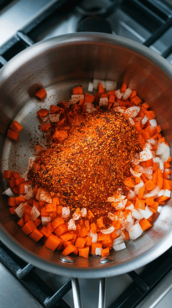 Add 1 teaspoon ground cumin, 1 teaspoon ground coriander, 1 teaspoon smoked paprika, ½ teaspoon ground cinnamon, and ¼ teaspoon cayenne pepper. Stir well to coat the veggies in the spices, cooking for 1-2 minutes.