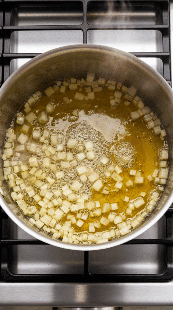 Heat 2 tablespoons of olive oil in a large pot over medium heat. Add 1 diced yellow onion and cook for about 5 minutes until soft and translucent.