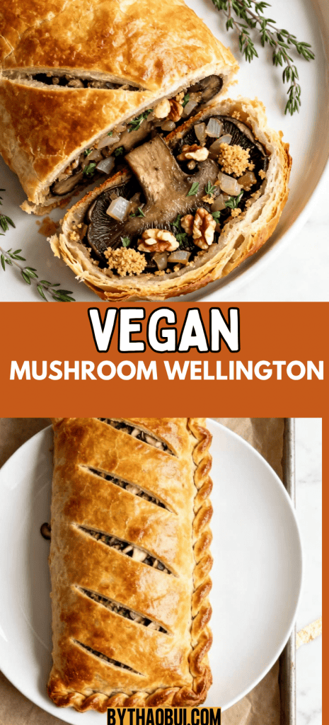 It’s got big, juicy portobello mushrooms wrapped in a layer of garlicky herbed mushroom filling, all tucked inside crispy, golden puff pastry.