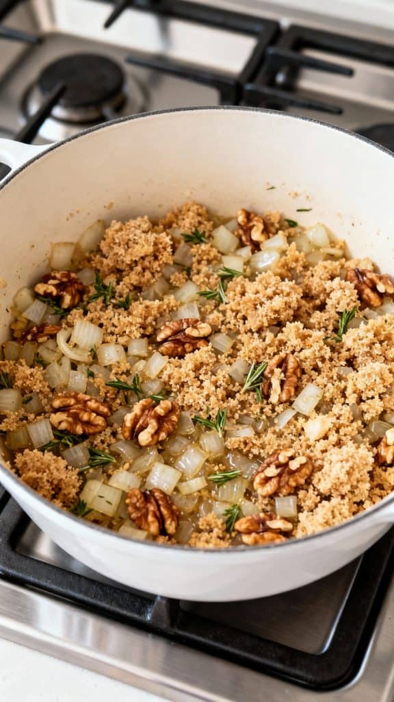 Stir in 1/2 cup chopped walnuts and 1/2 cup breadcrumbs. Mix everything together until it forms a thick, scoopable mixture. Cook for 1 more minute and let it cool.
