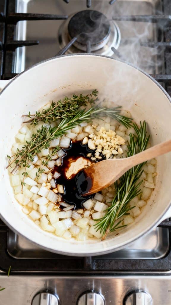Add 1 teaspoon chopped fresh thyme, 1 teaspoon chopped rosemary, 1 tablespoon soy sauce, and 1 tablespoon balsamic vinegar to the onion mix. Stir and cook for 2 more minutes.