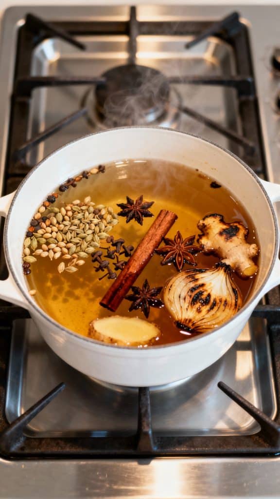 - Toasted spices like star anise and cinnamon build a traditional pho base
