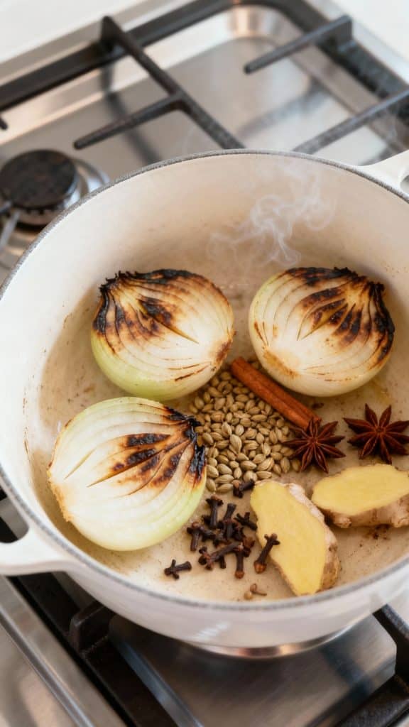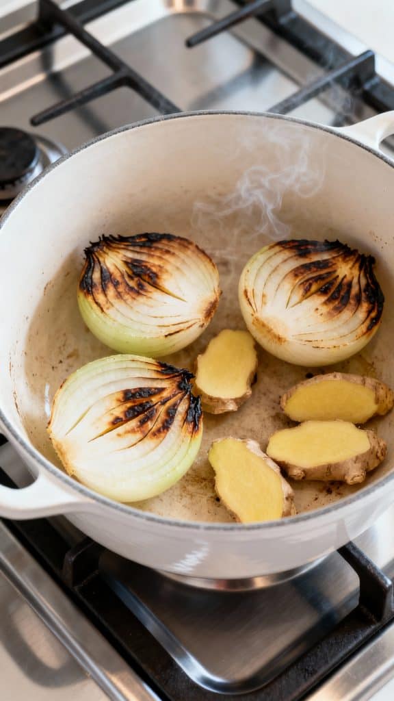 Place 1 onion (halved) and 1 piece of ginger (halved lengthwise) cut-side down in a dry pot. Cook over medium-high heat for 3–5 minutes until they are lightly charred and fragrant.