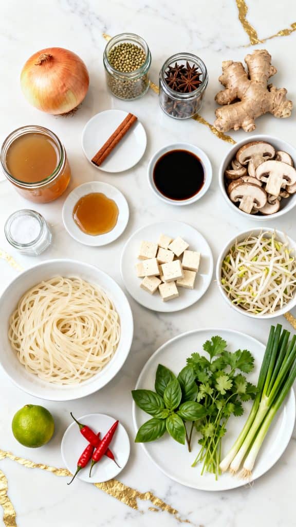 In each bowl, add a portion of cooked rice noodles. Pour hot broth over top, then add tofu, mushrooms, bean sprouts, red chili, and fresh herbs. Serve with lime wedge and optional sauces.