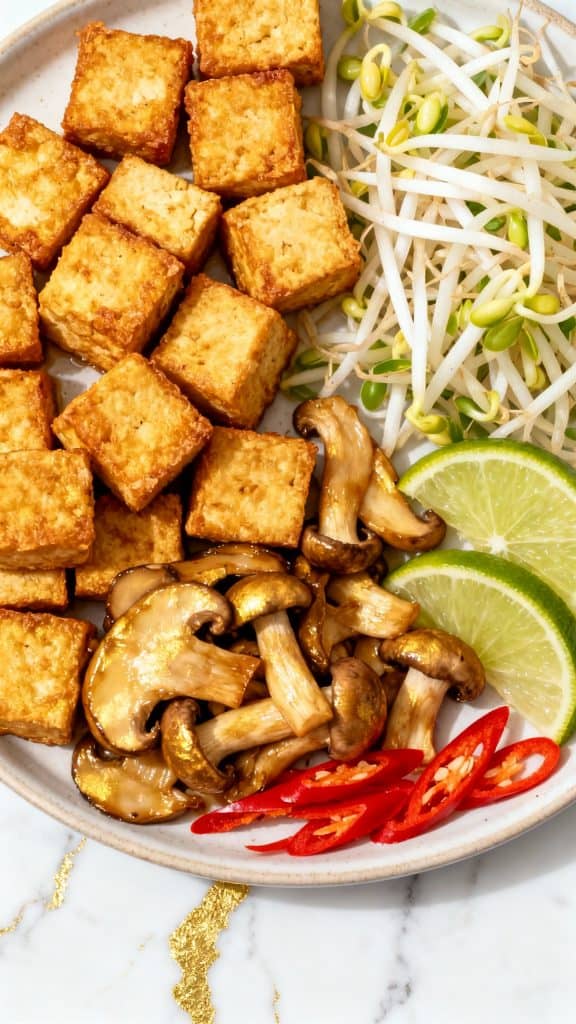 While broth simmers, pan-fry or bake 1 cup tofu cubes until golden. Slice 1 cup mushrooms, prep 1 cup bean sprouts, slice red chili, and cut lime into wedges.