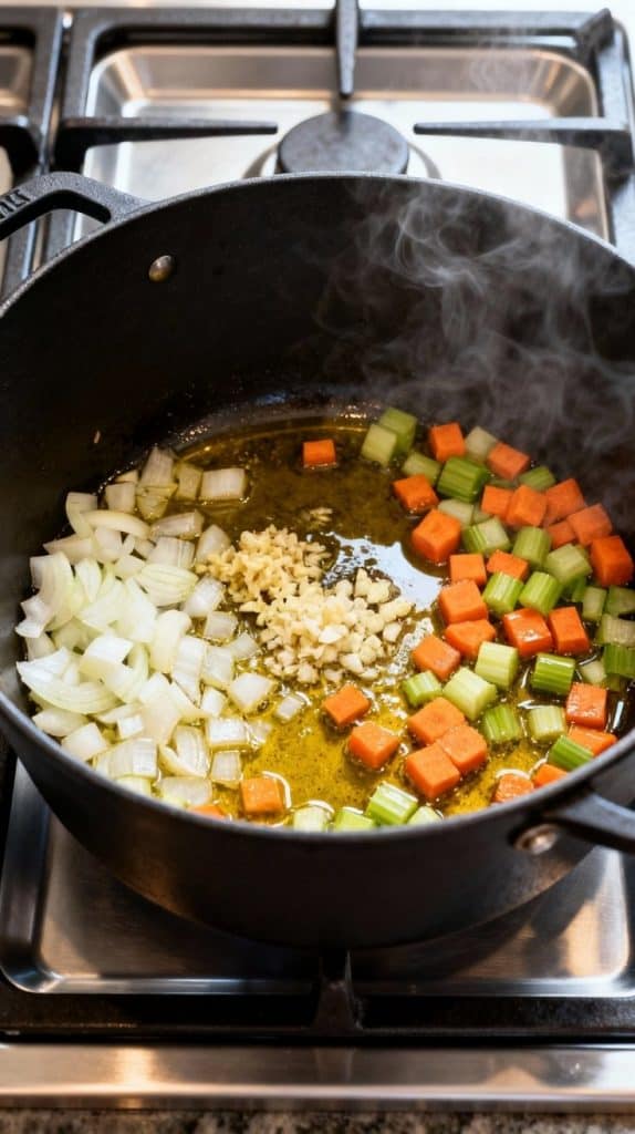 Heat 1 tablespoon olive oil in a large pot over medium heat. Add 1 diced onion, 2 minced garlic cloves, 2 diced carrots, and 2 diced celery stalks. Cook for about 5–6 minutes until the veggies are softened and fragrant.