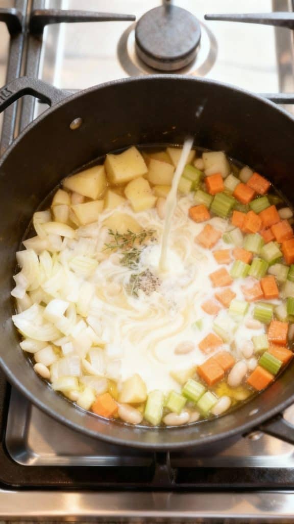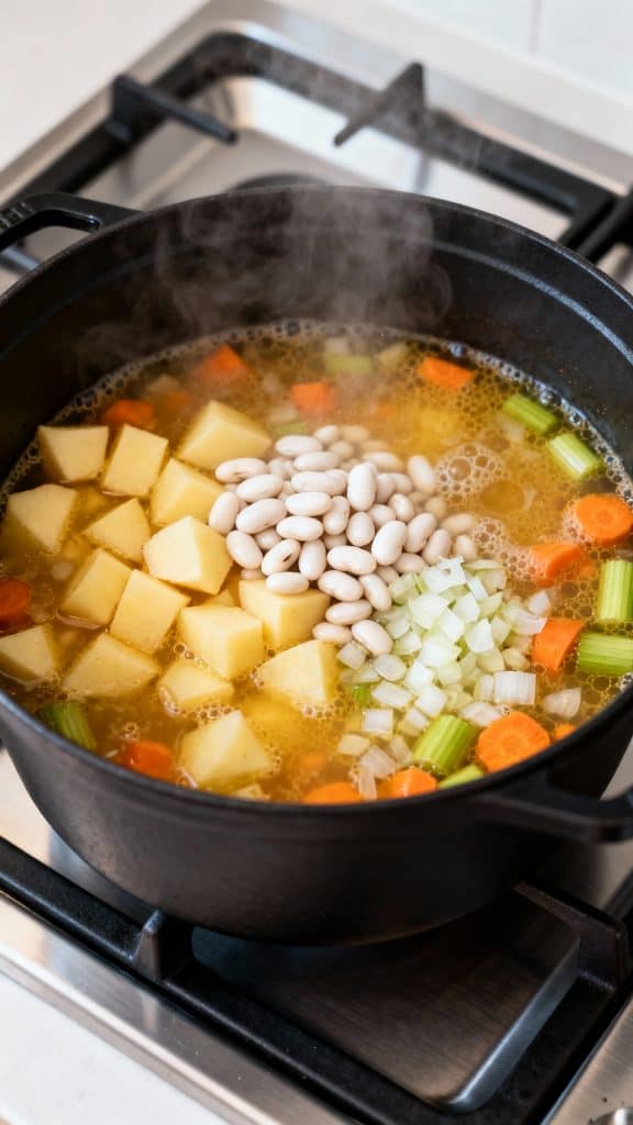 The starch from the potatoes helps naturally thicken the soup as it simmers. White beans add creaminess and protein, while simmering everything together lets the flavors blend. Adding milk at the end gives it a smooth finish without overpowering the veggie flavors.