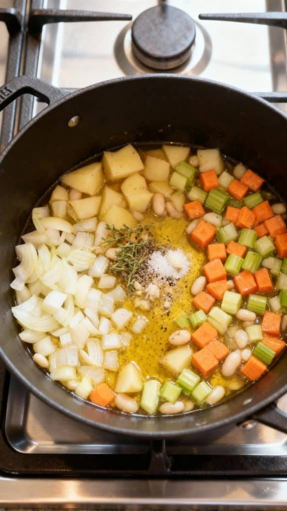 Stir in 3 peeled and diced russet potatoes, 1 drained can of white beans, 4 cups vegetable broth, 1 teaspoon dried thyme, 1 teaspoon salt, and ½ teaspoon black pepper. Stir well.