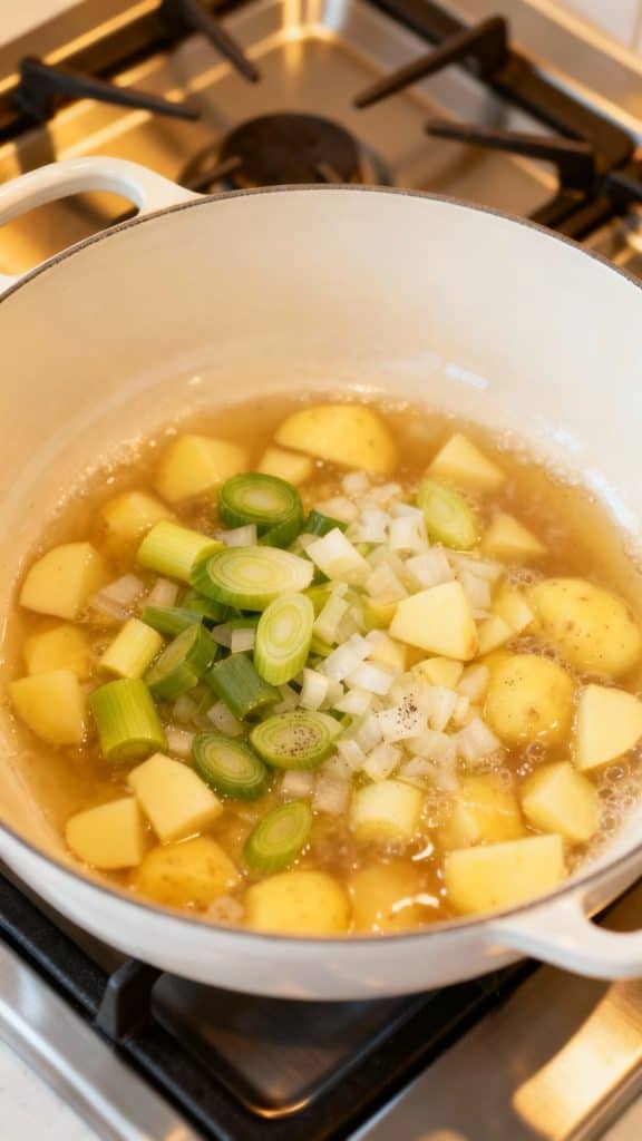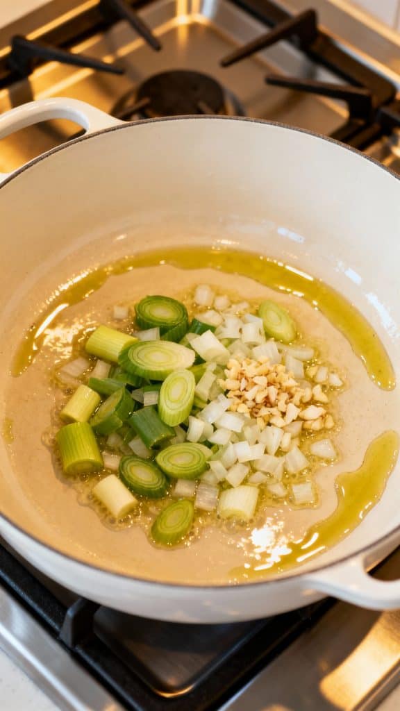 Heat 2 tablespoons olive oil in a large pot over medium heat. Add 3 sliced leeks, 1 diced onion, and 2 minced garlic cloves. Cook, stirring often, for about 6–8 minutes, until soft and fragrant.