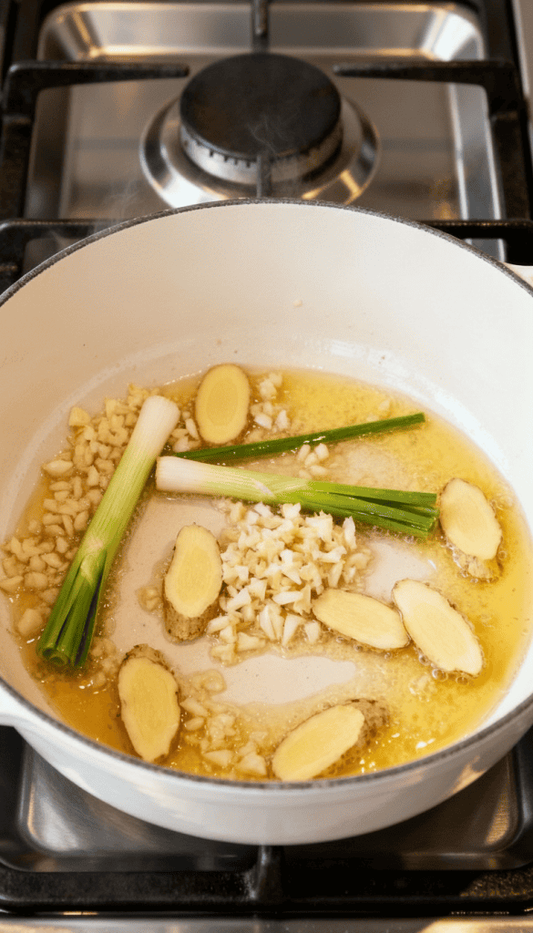 Heat 1 tablespoon coconut oil in a medium pot over medium heat. Add 3 minced garlic cloves, 1 stalk of smashed lemongrass, and 3 slices of galangal. Sauté for about 2 minutes, stirring until fragrant.
