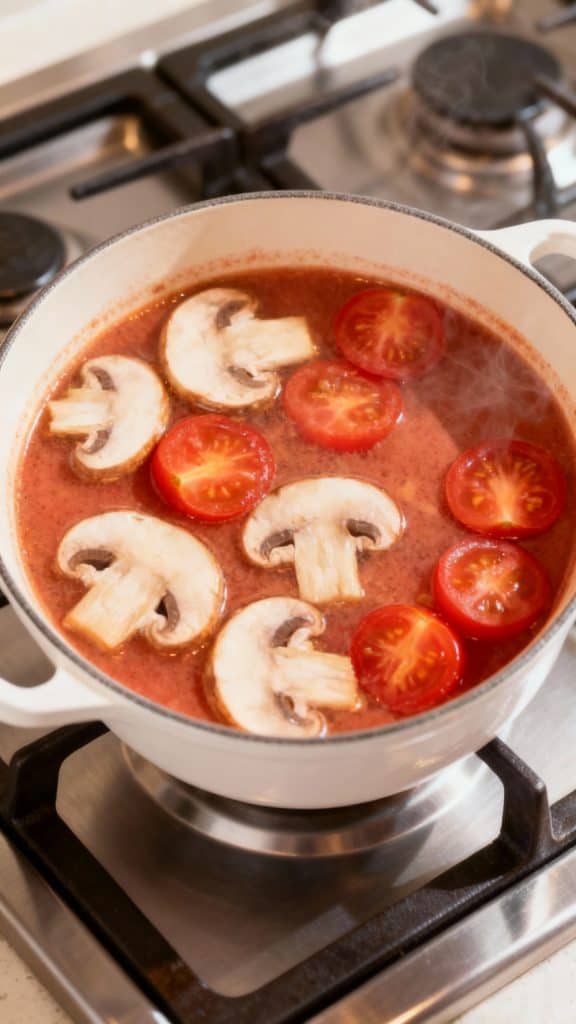 Add 1 cup sliced mushrooms and 1 cup halved cherry tomatoes. Stir and simmer for another 5 minutes.
