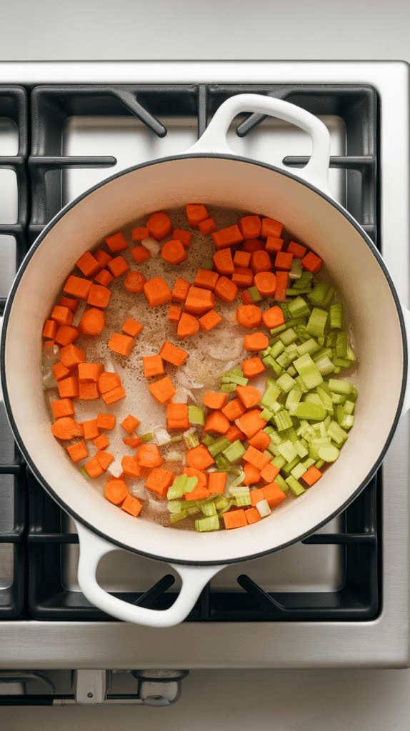 Add 2 diced carrots and 2 diced celery stalks. Stir and cook for 5 minutes until slightly tender.