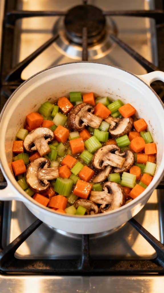 Add the carrots and celery and cook for about 5 minutes, stirring often. Then stir in the sliced mushrooms and cook for another 5 minutes until they release their liquid and soften.