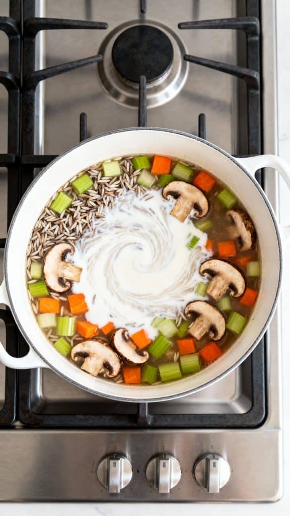 Once the rice is tender, stir in the coconut milk. Simmer uncovered for another 5–10 minutes to let it all come together.