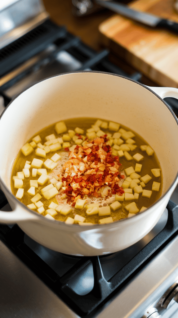 Heat 1 tbsp olive oil in a large soup pot over medium heat. Add 1/2 diced yellow onion, 3 cloves minced garlic, and 1/2 tsp red pepper flakes. Sauté for 3–4 minutes until the onion is soft and fragrant.